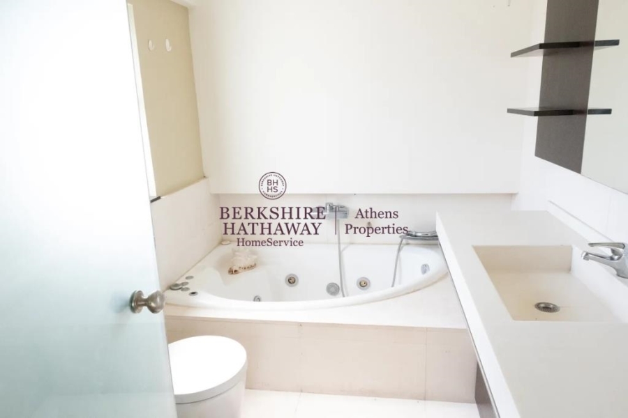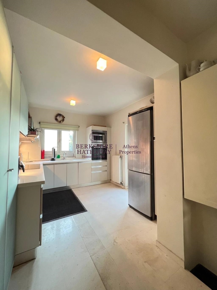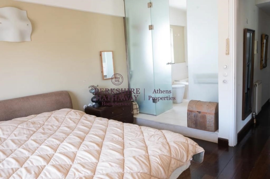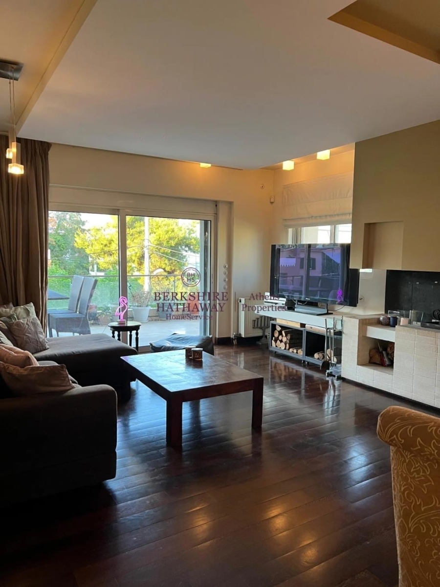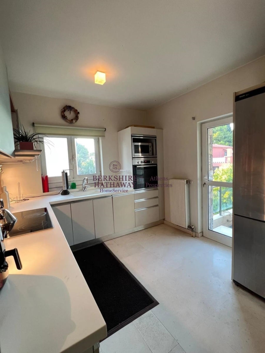 Το ακίνητο είναι διαμπερές, γωνιακό και προσόψεως, με μεγάλη περιμετρική βεράντα και θέα στο βουνό. Διαθέτει δύο υπνοδωμάτια με πολλές ντουλάπες Moda Bagno, εκ των οποίων το ένα είναι master με en suite μπάνιο, καθώς και δεύτερο πλήρες μπάνιο με μάρμαρα Costa Blanka. Το ευρύχωρο και φωτεινό σαλόνι με κομψή διακόσμηση και τζάκι συνδυάζεται αρμονικά με την semi-open κουζίνα Alta Linea, η οποία είναι πλήρως εξοπλισμένη με όλες τις ηλεκτρικές συσκευές Miele, πλυντήριο πιάτων και ρούχων, καθώς και όλες τις απαραίτητες μικροσυσκευές και σκεύη κουζίνας. Οι πάγκοι και οι νεροχύτες είναι από Corian, ενώ τα δάπεδα αποτελούνται από παρκέ Wenge και μάρμαρο υψηλής ποιότητας.