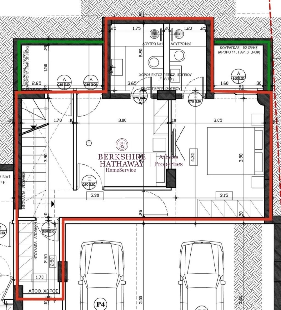 Η κατοικία αναπτύσσεται σε δύο επίπεδα και περιλαμβάνει υπερυψωμένο ισόγειο 40 τ.μ. με ενιαίο χώρο καθιστικού, τραπεζαρίας και κουζίνας με έξοδο σε μπαλκόνι πρόσοψης, ένα WC και εσωτερική σκάλα που οδηγεί στο κάτω επίπεδο. Το ημιυπόγειο 53 τ.μ. διαθέτει δύο master υπνοδωμάτια με en-suite μπάνια, πρόσβαση σε ανεξάρτητα κουραγκλέ με χώρο πρασίνου, φυσικό φωτισμό και εξαερισμό, καθώς και ντουλάπα-αποθηκευτικό χώρο.