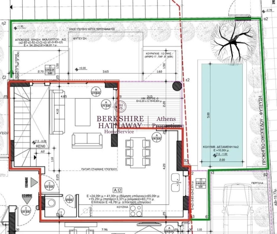 Στους εξωτερικούς χώρους προσφέρεται αποκλειστική χρήση ακάλυπτου χώρου 56,81 τ.μ. και ιδιωτική πισίνα 10 τ.μ., ενώ στα βοηθητικά περιλαμβάνονται υπόγεια θέση στάθμευσης 11,55 τ.μ. και υπόγεια αποθήκη 3,15 τ.μ.